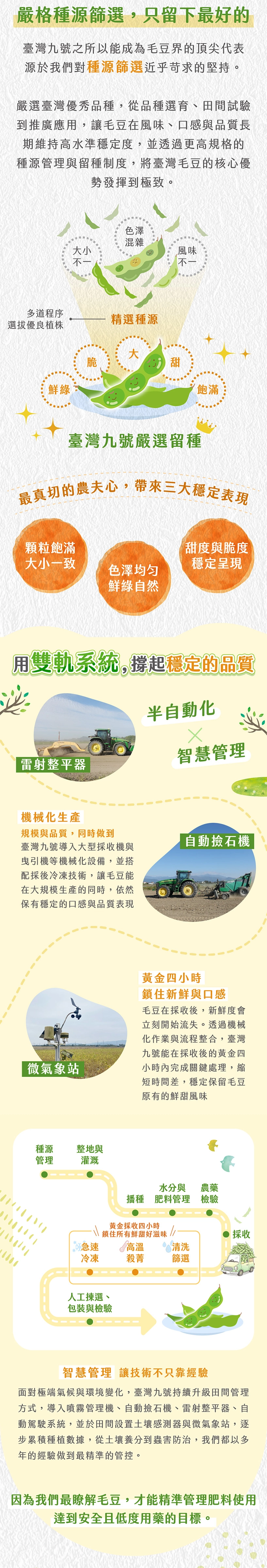 神農獎肯定的台灣九號非基改毛豆仁,由「毛豆先生」周國隆培育,產自高雄旗山,豆粒翠綠如玉、鮮甜無豆腥味。採收後 4 小時內加工,急速冷凍鎖住鮮度與營養,免剝殼、免解凍、免清洗,下鍋即用,健身族與素食者的綠色首選。