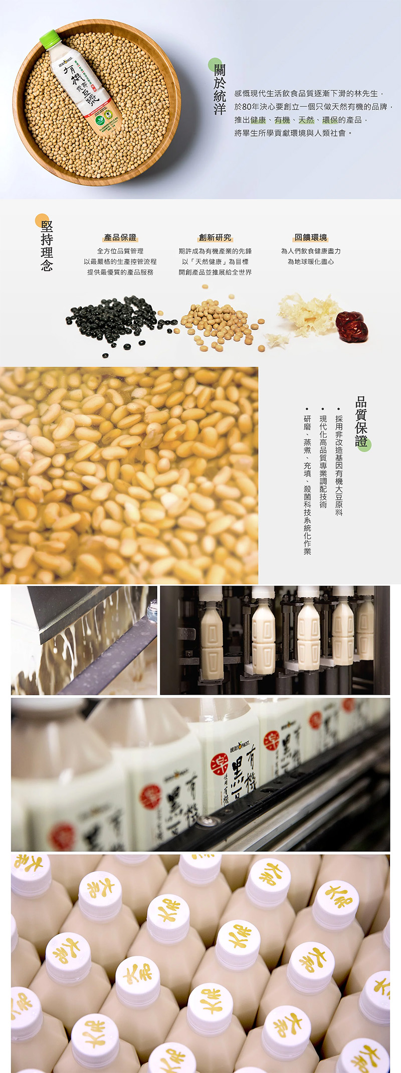 堅持使用上等的黃豆、黑豆磨煮,搭配純淨的蘭陽水製造,豆香非常濃郁香醇順口,營養豐富,冷藏後風味更佳,亦可加溫飲用;是最自然又健康的養生的飲品,不添加防腐劑,不添加人工香料及色素,含純天然植物性蛋白質及大豆異黃酮,營養豐富、味甜甘美。