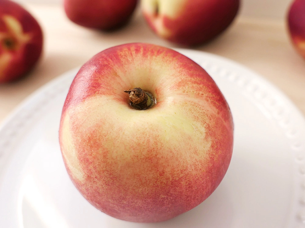 白甜桃(Nectarine)外型與水蜜桃相似,最大特色在於表皮光滑無絨毛,入口清爽不膩。馥果嚴選陽光充足、水源純淨的果園,孕育出風味純淨、甜度出眾的優質白甜桃。