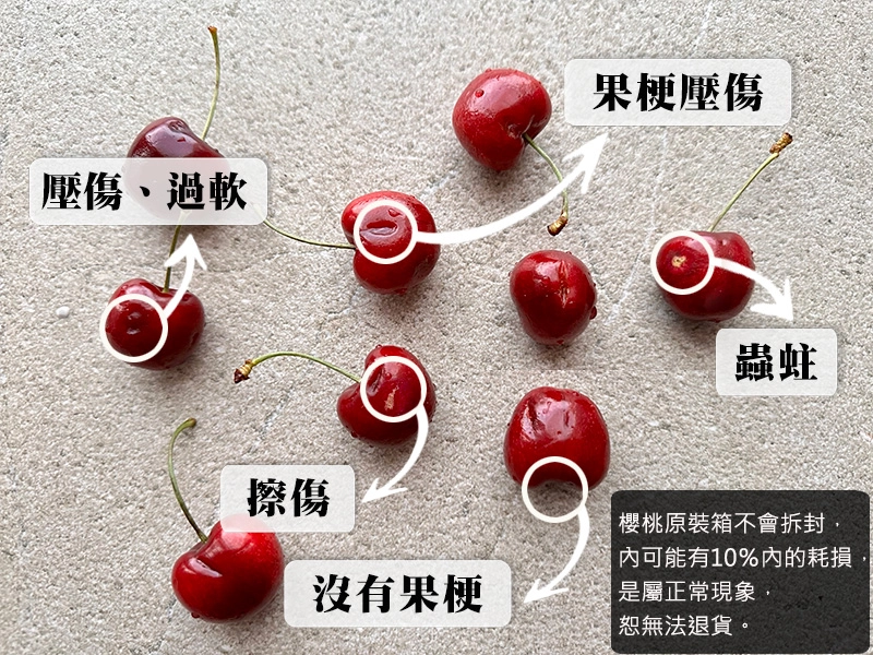 ❶ 櫻桃色澤和果梗顏色因產地氣候或品種每批不盡相同,果梗也不一定皆為綠色。天然產品可能會有部分缺陷、脫梗或者外觀不美麗的情況,但不影響果實的新鮮度!
