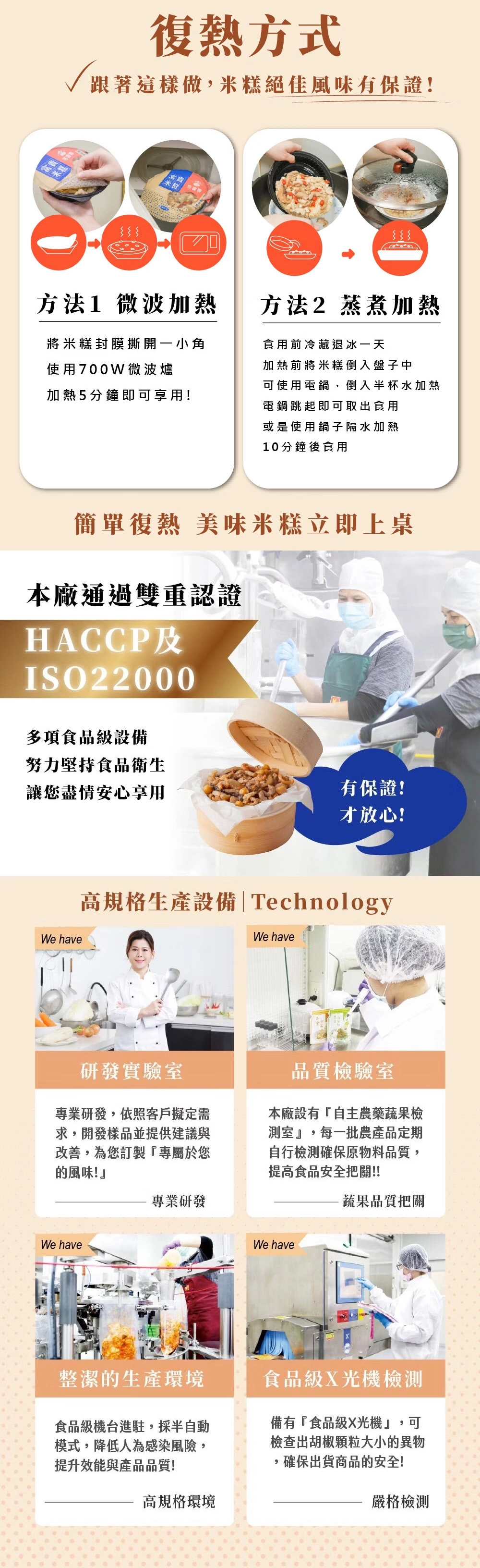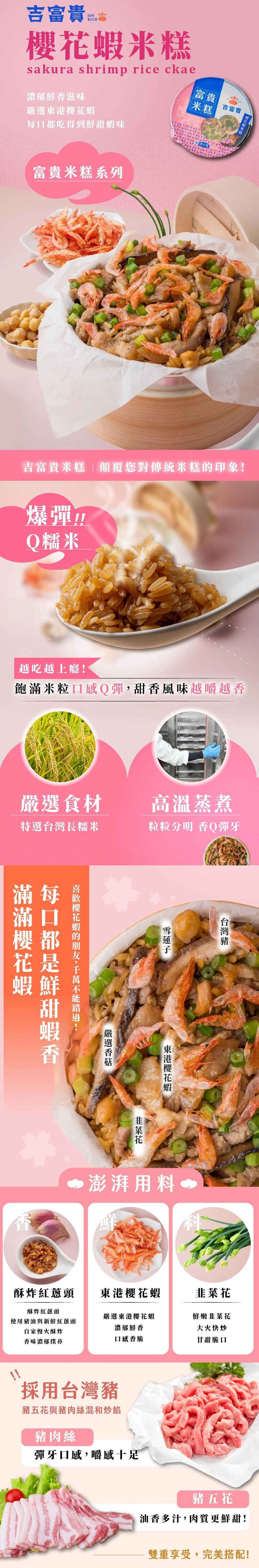 櫻花蝦米糕:熟糯米(糯米、水)、豬肉(台灣)、醬油、雪蓮子、韭菜、油蔥【紅蔥頭、香豬油王固態酥炸油(植物油(棕櫚油)、豬脂(熬製)、抗氧化劑-維生素E(混合濃縮生育醇、芥花油))、香豬油王液態酥炸油(植物油(軟棕油、芥花油)、豬脂(熬製)、抗氧化劑-維生素E(混合濃縮生育醇、芥花油))、蔥酥(蔥頭、麥鮮麩皮、棕櫚油、玉米澱粉)、醬油】、香菇、砂糖、米酒、櫻花蝦、薑麻油(芝麻油、薑) 、大豆沙拉油、蝦米、水麥芽(樹薯澱粉、水)、高纖味精【L-麩酸鈉、5'-次黃嘌呤核苷磷酸二鈉、5'-鳥嘌呤核苷磷酸二鈉】、薑、白胡椒粉(白胡椒)
