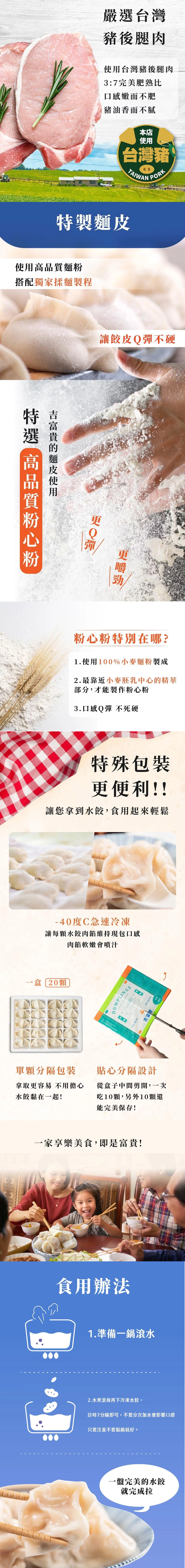 一盒20顆,每顆重28g,份量超足!3種豬肉水餃均使用台灣豬後腿肉,3:7完美肥熟比,口感嫩而不肥;麵皮採用「粉心粉」製作,餃皮更Q彈筋道,讓您越嚼越香。