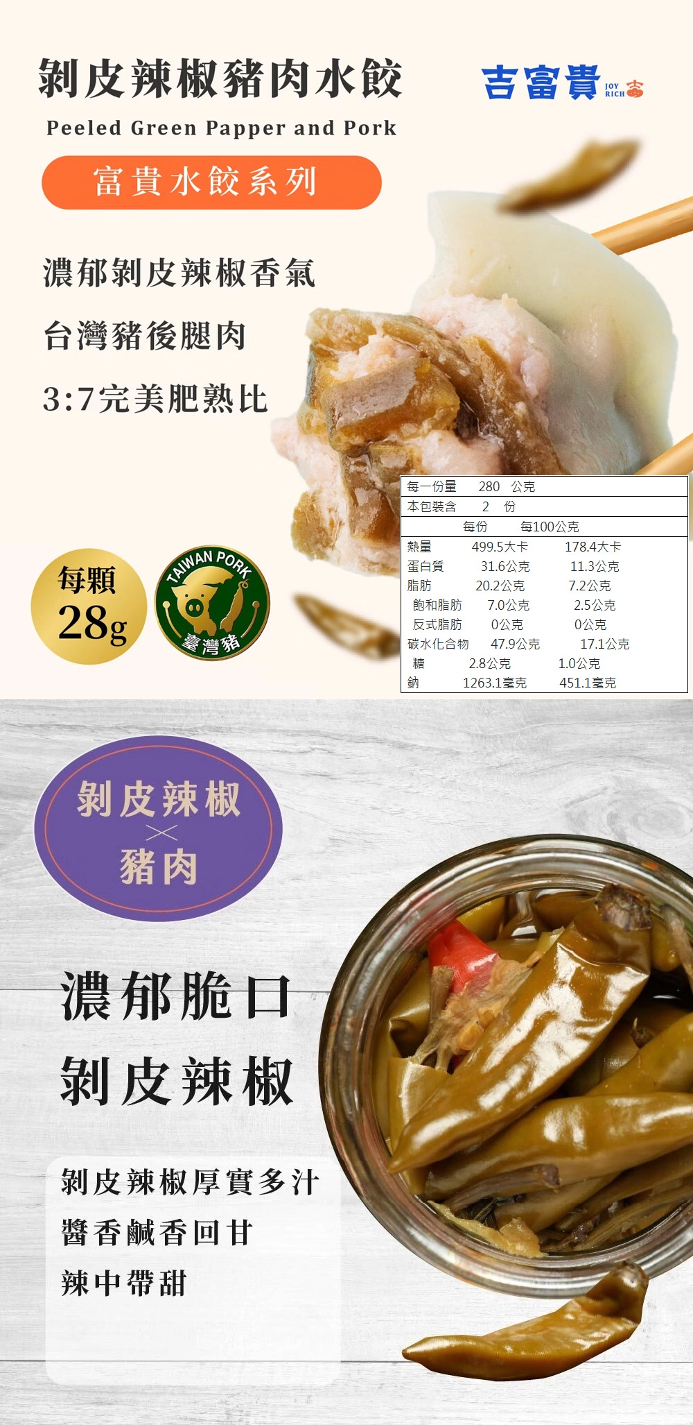 剝皮辣椒豬肉水餃:精選剝皮辣椒,風味濃郁辣中帶甘,肉質厚實多汁超 juicy。