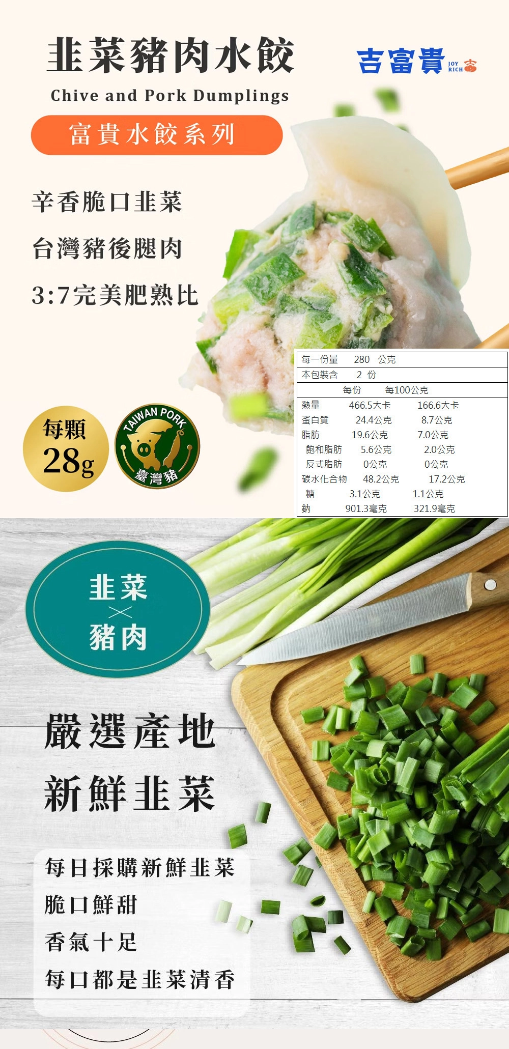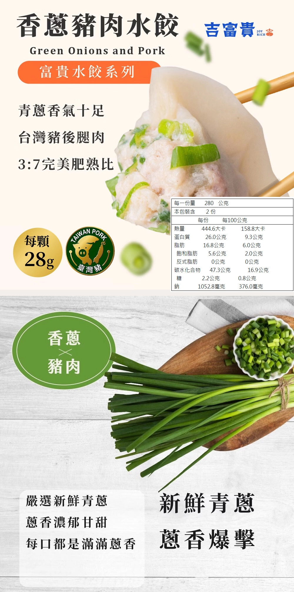 香蔥豬肉水餃:產地特選青蔥,蔥香濃郁口感爽脆,入口濃郁蔥香,風味清爽尾韻回甘。