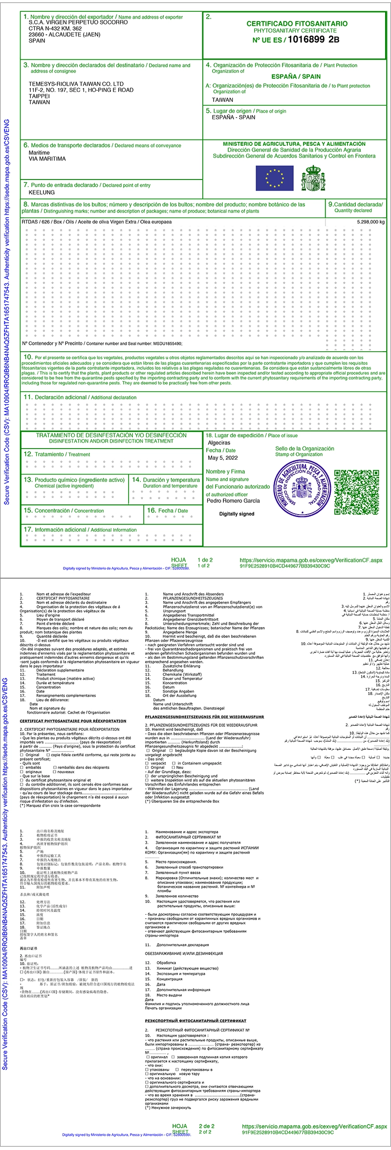 安心認證:西班牙政府食品安全衛生檢驗證明
