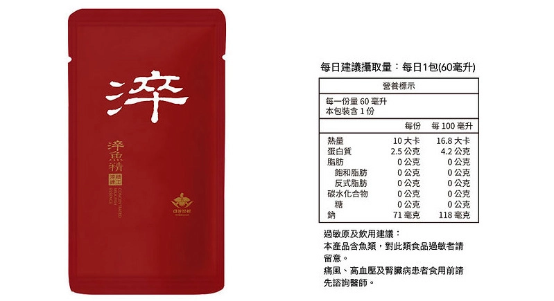 獨家淬鍊工法完整保留人體所需的 18 種胺基酸、牛磺酸、多醣體,低鈉、無普林、不會引起痛風;入口濃醇無腥味,每一滴都表現出台灣現代料理工藝的結晶。
