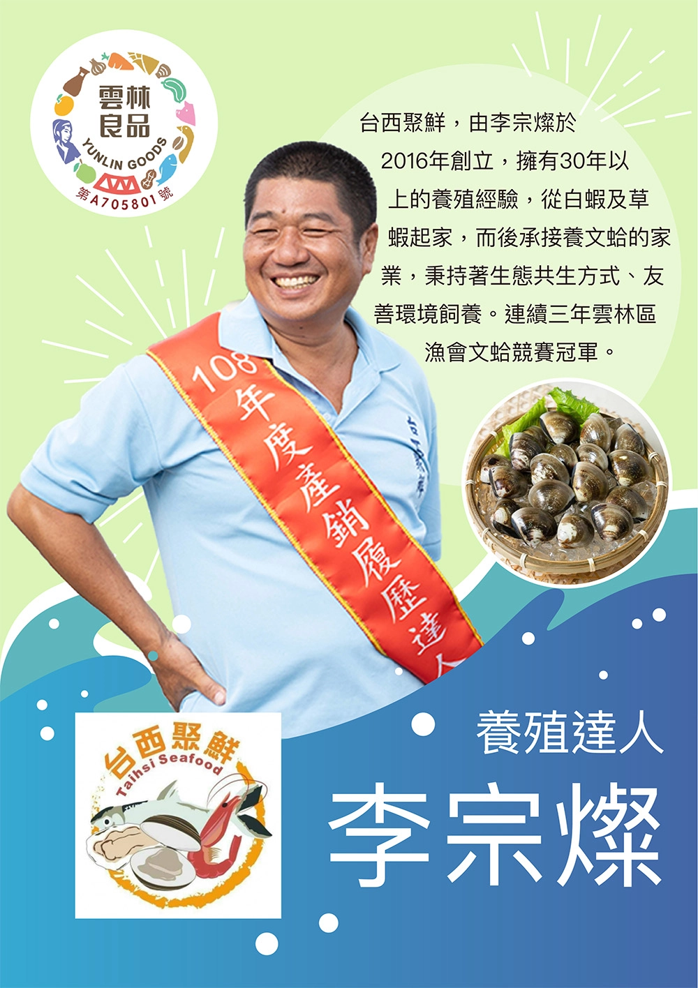 從白蝦、草蝦起家,延續家族養殖文蛤的傳統,以「生態共生、友善環境」為核心理念,並擁有超過 30 年的養殖經驗。