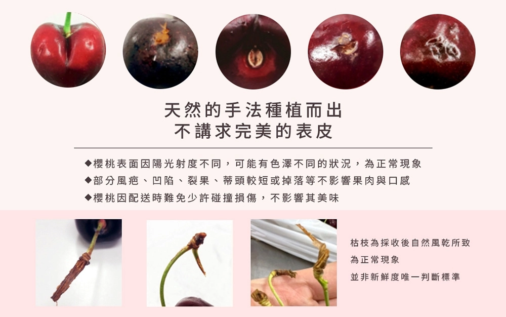 ❶ 櫻桃色澤和果梗顏色因產地氣候或品種每批不盡相同,果梗也不一定皆為綠色。天然產品可能會有部分缺陷、脫梗或者外觀不美麗的情況,但不影響果實的新鮮度!