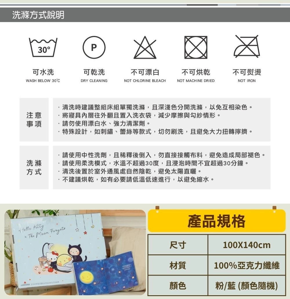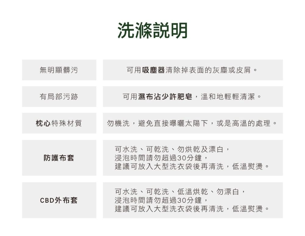 ❶ 被子、枕套:可水洗、可乾洗、勿烘乾、勿漂白;浸泡時間請勿超過 30 分鐘,建議可放入大型洗衣袋後再清洗。
