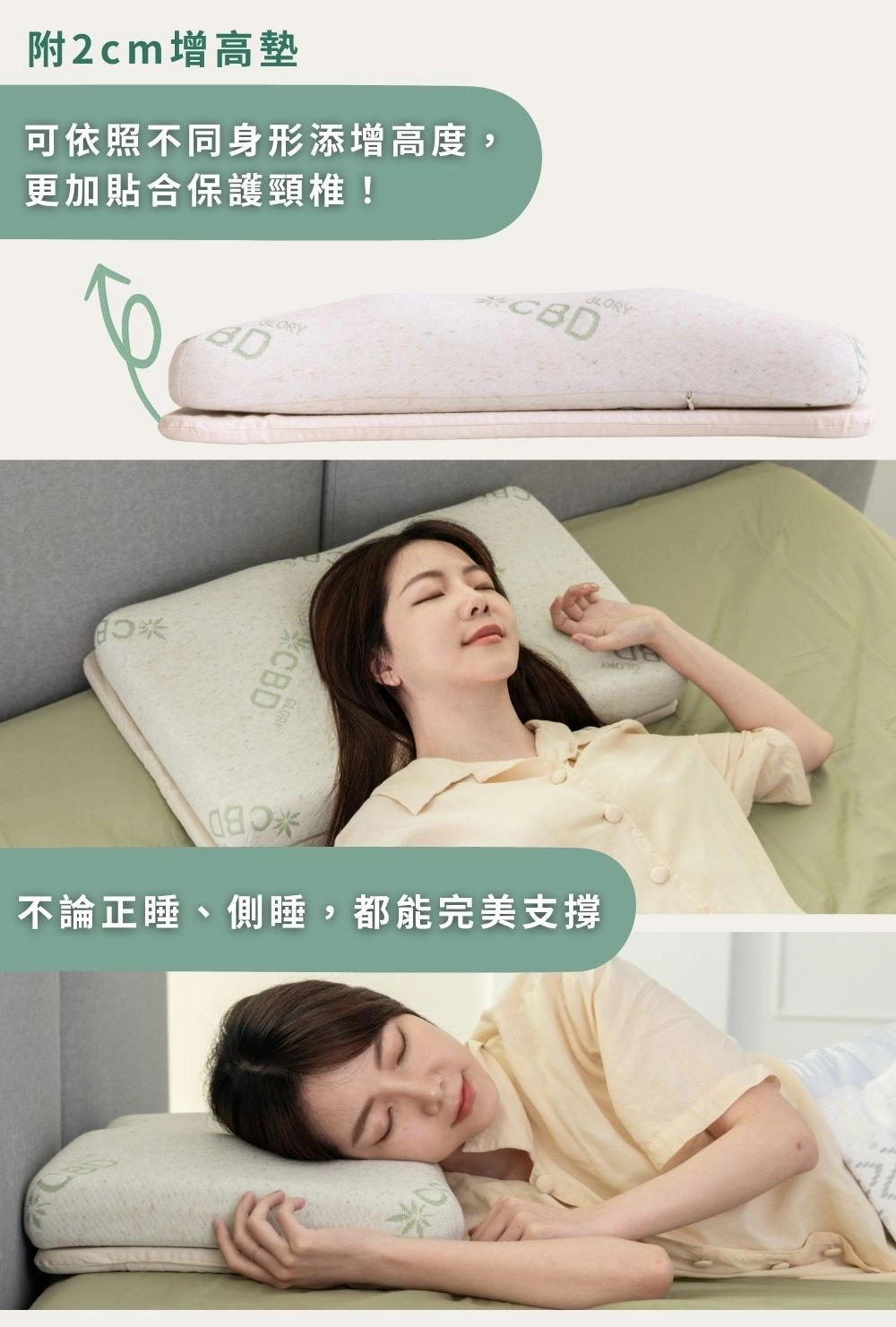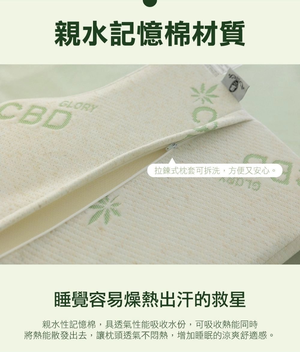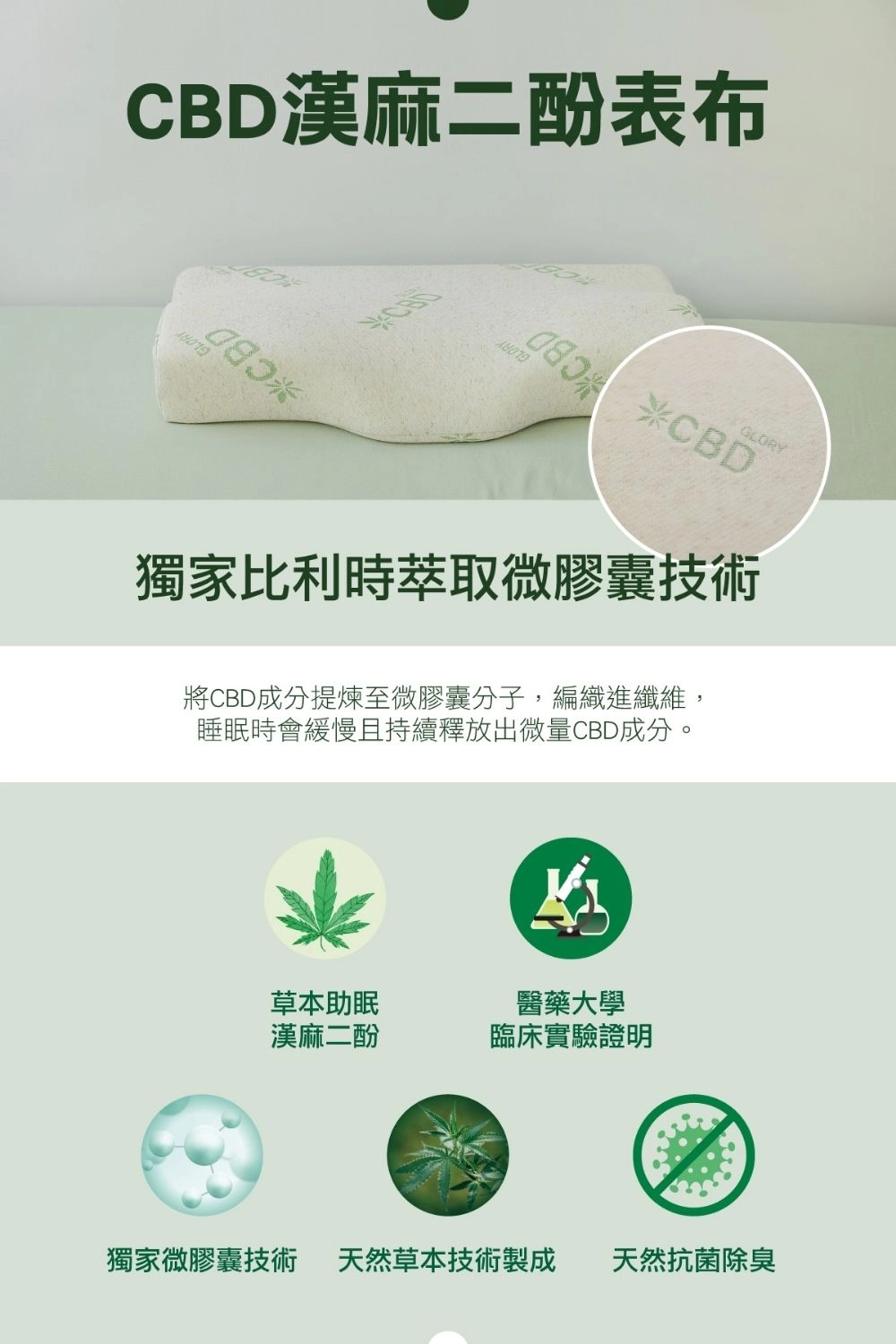 採用比利時專利微膠囊萃取技術,將 CBD (助眠漢麻二酚) 成分提煉至微膠囊分子,再編織進枕頭纖維中,讓舒緩成分在你入眠時持續釋放。