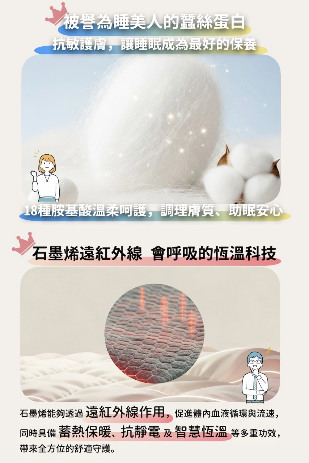 富含 18 種天然胺基酸,具備保濕美膚、抗菌防蟎特性,觸感柔順親膚,就像被輕柔的雲朵擁抱,讓肌膚在睡夢中也能被溫柔照顧。