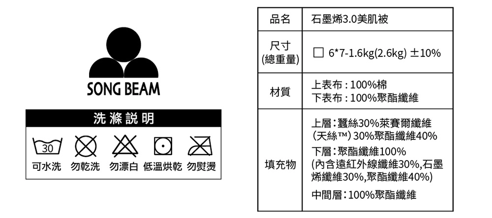 .下層:聚酯纖維100% (內含遠紅外線纖維30%,石墨烯纖維30%,聚酯纖維40%)