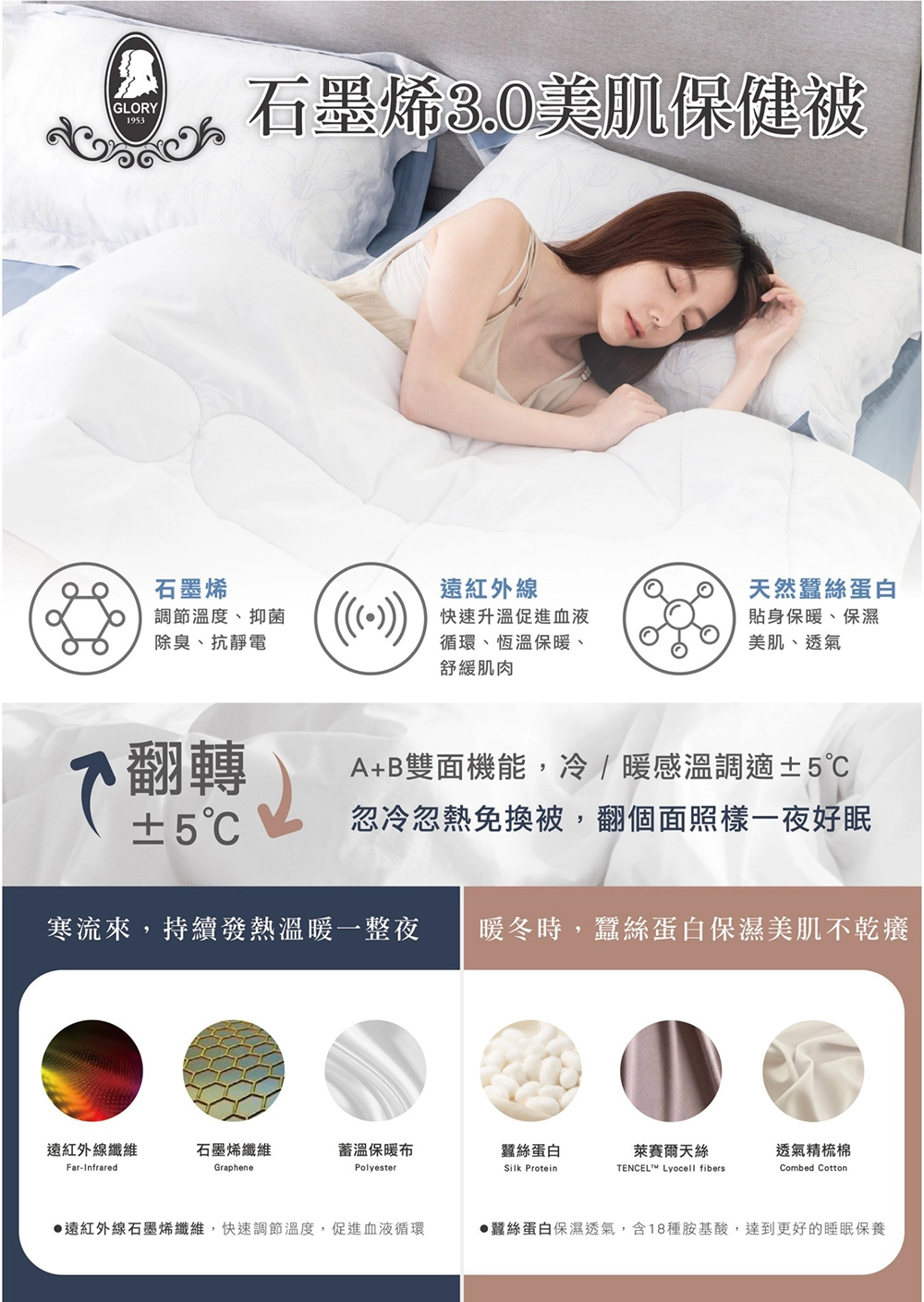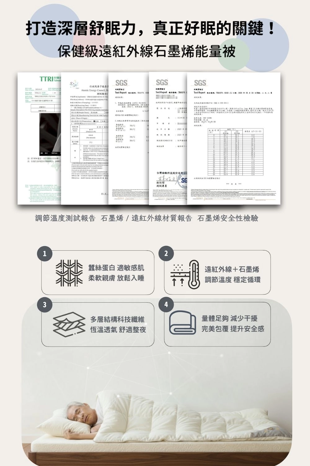 溫控升級的關鍵所在!能有效促進血液循環、調節體溫,在寒冬裡鎖暖,在夏夜中透氣不悶熱,從入睡到清晨,體感始終舒適,讓睡眠品質自然提升。