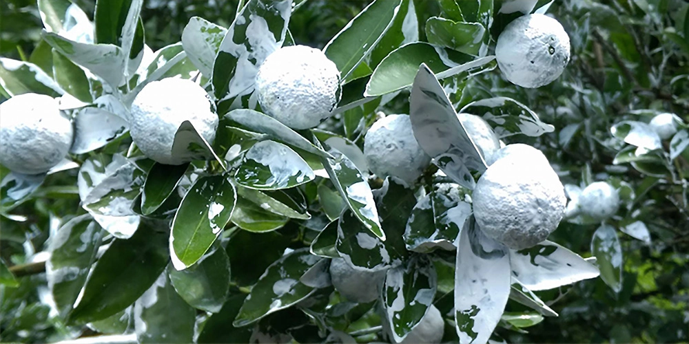 為了守住柑橘的品質,羅大哥想出獨特的方式——幫柑橘「敷面膜」,他運用白色碳酸鈣能反射陽光的特性,再加入牛奶、胺基酸等天然成分,研製出獨家配方的防曬面膜;接著靠人工一顆一顆仔細塗抹在果皮上,還需隨時巡園觀察,依光照角度變化適時補塗。
