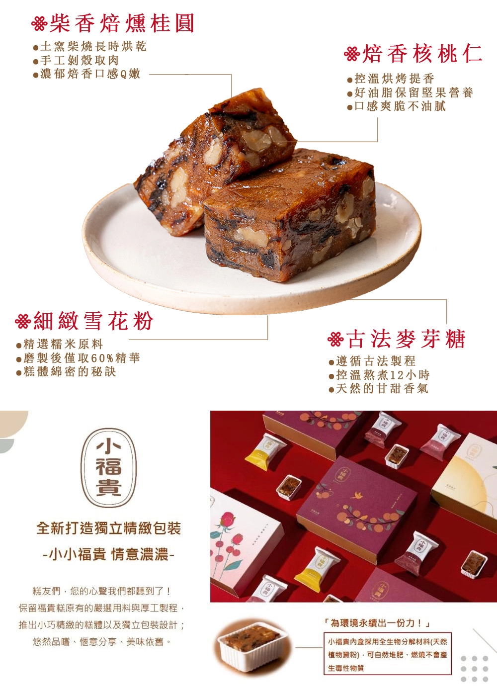 糯米細磨後,僅取最細緻 60%的「雪花糯米粉」 入料,因此糕體格外綿密細緻,入口柔軟不黏牙;搭配 柴燒桂圓的濃郁燻香、以及 低溫烘烤核桃的堅果香氣與酥脆口感,再以 古法熬製麥芽取代一般水飴,帶來自然清甜、香而不膩。