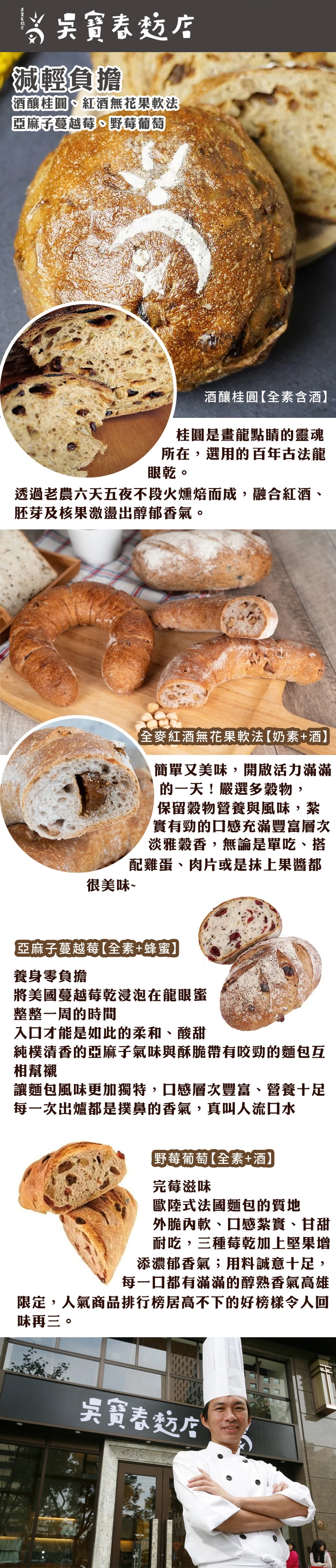 吳寶春-減輕負擔 (酒釀桂圓、紅酒無花果軟法、亞麻子蔓越莓、野莓葡萄)/4入