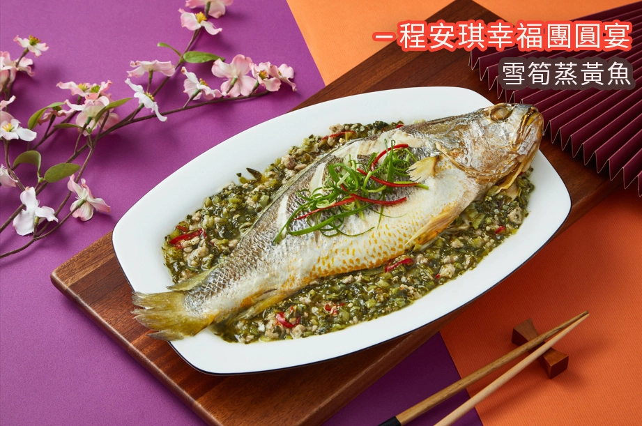 雪筍蒸黃魚:雪裡紅的鹹香與嫩筍交織,燉入鮮嫩黃魚,層次豐富。魚肉細緻綿滑,筍香脆爽,齒頰留香,是道色香味俱全的功夫年菜。