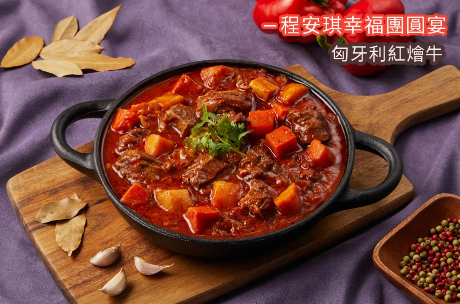 匈牙利紅燴牛:精選牛肋條搭配蔬菜與香料慢燉,醬汁濃郁,牛肉軟嫩入味,展現歐式經典家常風味。