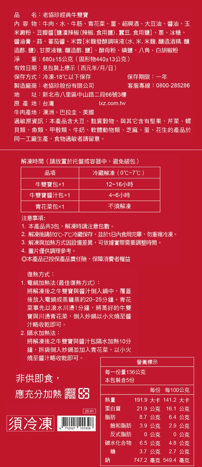 經典牛雙寶:牛肉、水、牛筋、青花菜、薑、紹興酒、大豆油、醬油、玉米澱粉、豆瓣醬[鹽漬辣椒 (辣椒.食用鹽).蠶豆.食用鹽]、蔥、冰糖、醬油膏、蒜、蕃茄醬、米霖[米麴發酵調味液 (水.米.米麴.釀造酒精.釀造酢.鹽).甘蔗液糖.釀造酢.鹽]、酵母粉、鹽、八角、白胡椒粉