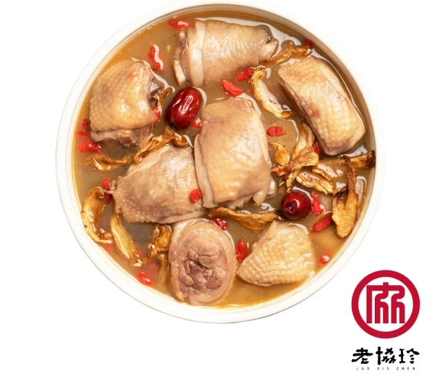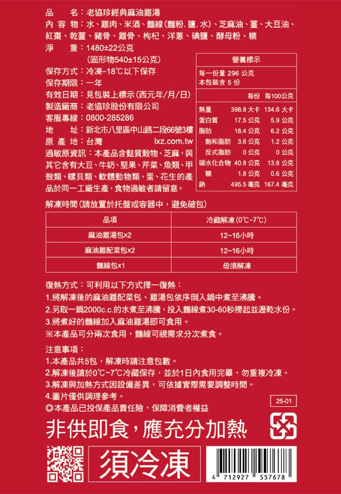 經典麻油雞湯:水、雞肉、米酒、麵線 (麵粉.鹽.水)、芝麻油、薑、大豆油、紅棗、乾薑、豬骨、雞骨、枸杞、洋蔥、碘鹽、酵母粉、糖