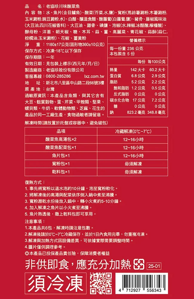 川味酸菜魚:水、魚片(金目鱸魚)、酸菜(芥菜.水.鹽)、寬粉(馬鈴薯澱粉.木薯澱粉.玉米澱粉.豌豆澱粉.水)、白醋、釀造食醋、酸蘿蔔(白蘿蔔.鹽)、豬骨、藤椒風味油(大豆油.四川花椒香料)、大豆油、雞骨、碘鹽、泡椒(水.辣椒.冰醋酸.檸檬酸)、酵母粉、洋蔥、朝天椒、糖、木耳、蒜、薑、高麗菜、青花椒、蒜酥(蒜仁.棕櫚油.玉米澱粉)、花椒、薑黃粉