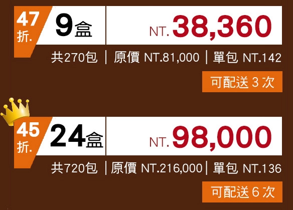 ❸ 購買 (30包) 9盒以上可分次配送;如有配送問題請電洽 0800-500-068。
