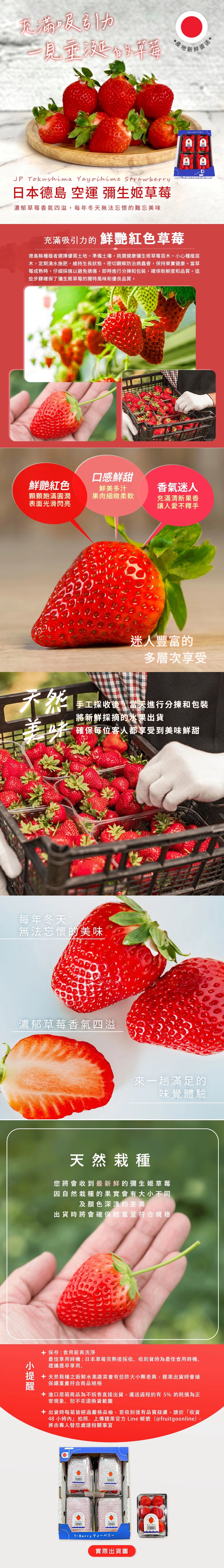 來自日本德島縣的彌生姬草莓,以鮮艷亮紅的外觀一眼就抓住目光;當地種植者嚴選優質土壤,細心整地培土,挑選健康苗木種植,並依生長狀態定期澆水與施肥,全程密切管理、防治病蟲害,只為讓每一顆草莓都在最佳狀態下成熟。
