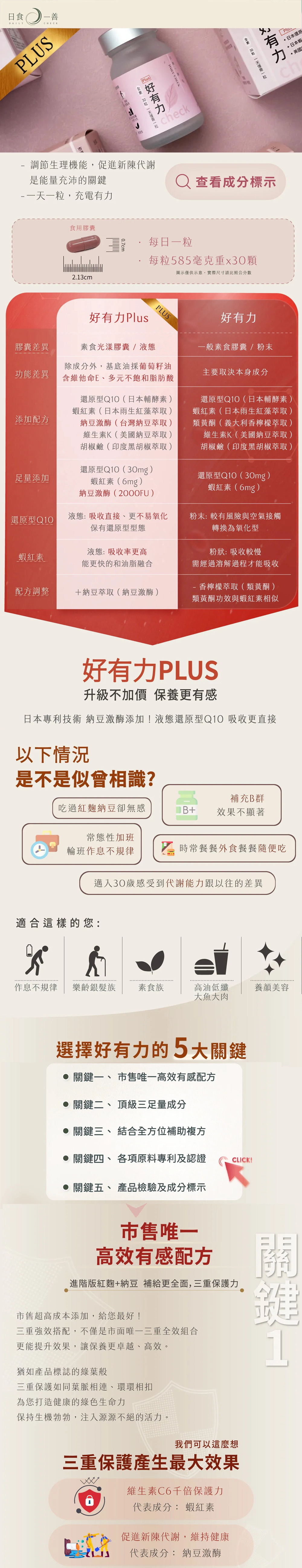 全面性更勝紅麴的高效保健配方,市售唯一頂級三足量成分,集結 30mg 還原型 Q10、6mg 蝦紅素與 2000FU 納豆激酶,打造業界標竿含量;採用液態素食膠囊,吸收更直接、效果更有感,並嚴選國際大廠原料,全面防護再升級,陪你舒暢樂活每一天。