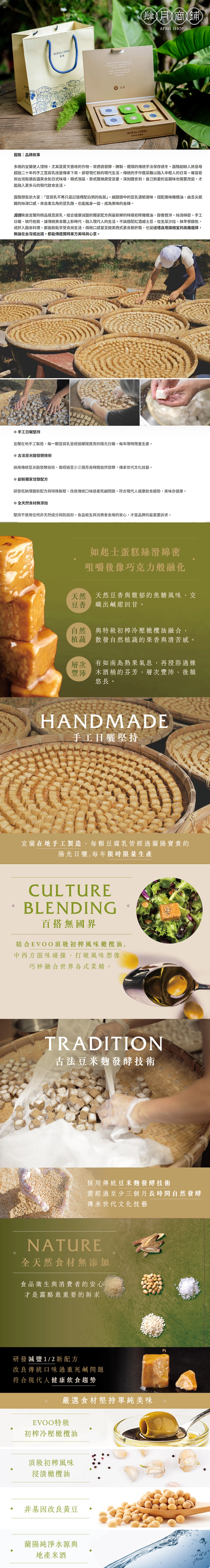 ❷ 青檸橄欖油豆腐乳:非基改豆腐 (黃豆、熟石膏)、特級初榨橄欖油、特級初榨檸檬風味橄欖油、糖、鹽、米酒、糯米、糙米、甘草 (全素)