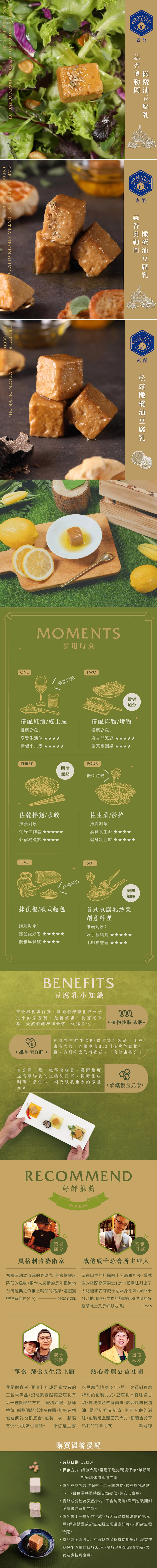 ❶ 松露橄欖油豆腐乳:非基改豆腐 (黃豆、熟石膏)、特級初榨橄欖油、特級初榨松露風味橄欖油、糖、鹽、米酒、糯米、糙米、甘草 (全素)