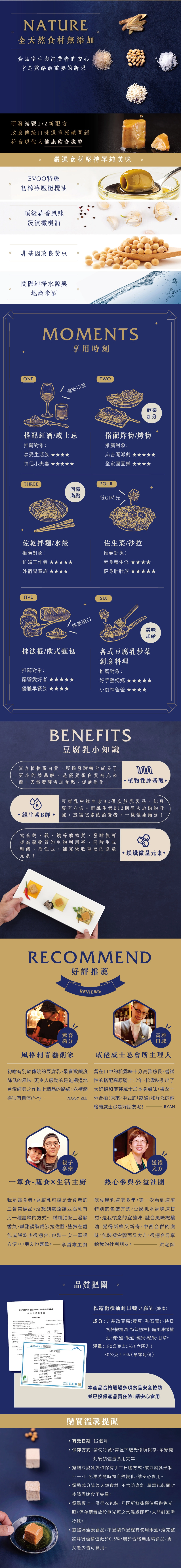 非基改豆腐 (黃豆、熟石膏)、特級初榨橄欖油、特級初榨松露風味橄欖油、糖、鹽、米酒、糯米、糙米、甘草 (全素)