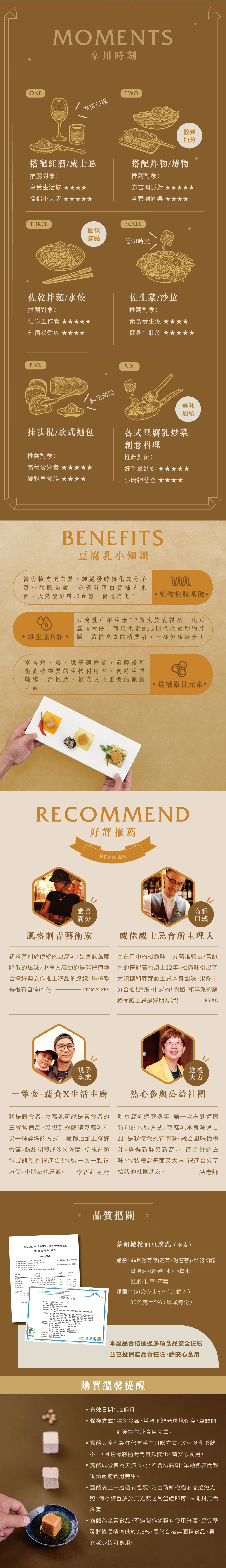 非基改豆腐 (黃豆、熟石膏)、特級初榨橄欖油、糖、鹽、米酒、糯米、糙米、甘草、茶葉
