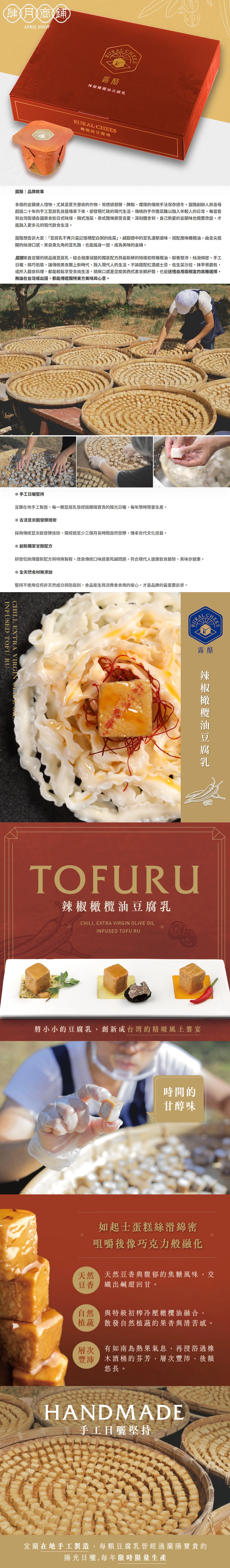 ❶ 露酪豆腐乳製作保有手工日曬方式,故豆腐乳形狀不一,且色澤將隨時間自然變化,請安心食用。