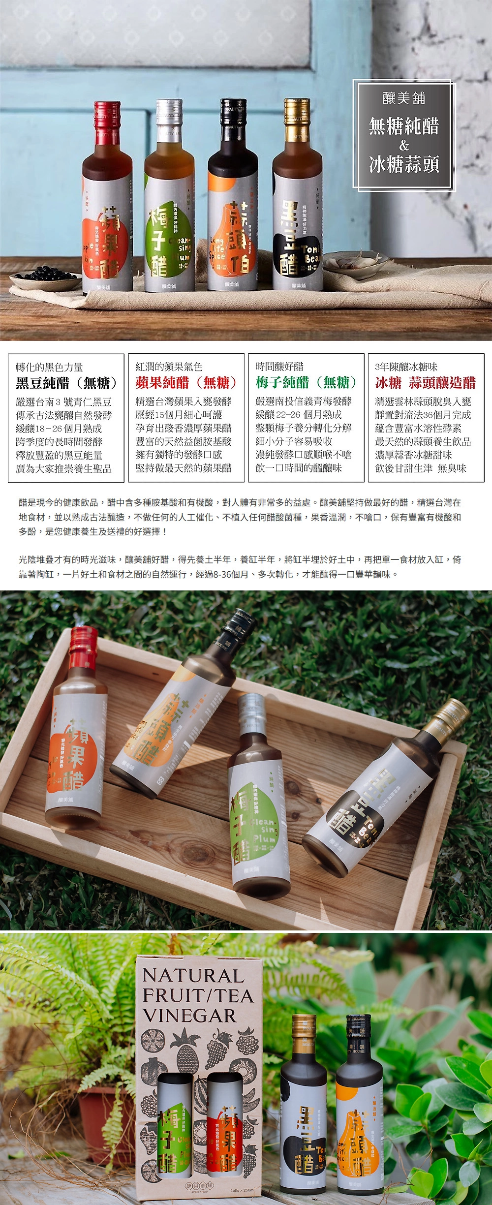 嚴選台灣在地食材,推出黑豆醋、梅子醋、蘋果醋與蒜頭醋四種風味任選兩瓶組合。採用古法自然發酵工藝,靜置熟成 24 個月以上,不添加催化劑與人工香料,讓酵素自然分解營養分子,幫助人體吸收,富含有機酸與礦物質。