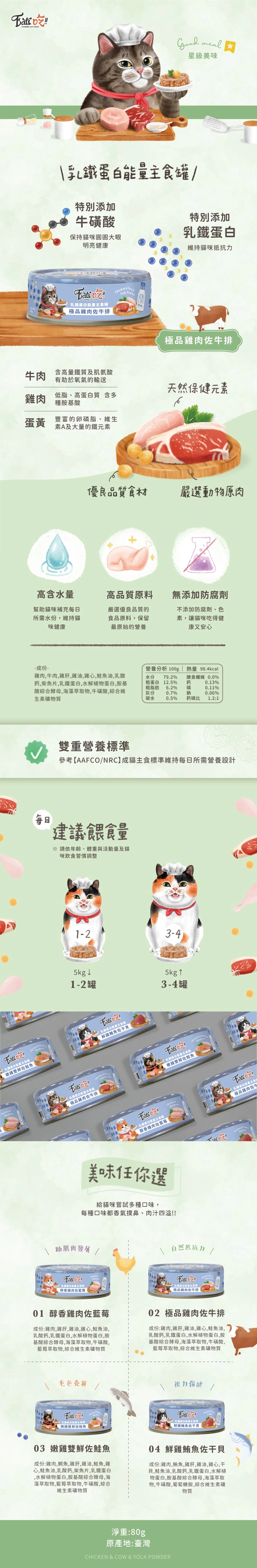 特別添加乳鐵蛋白,幫助維持良好抵抗力,同時補充牛磺酸,守護眼睛明亮健康;高含水量設計,讓毛孩在享受美味的同時,也能輕鬆補充每日所需水分。堅持選用優良品質原料,不添加防腐劑與色素,讓每一口都吃得健康又安心。