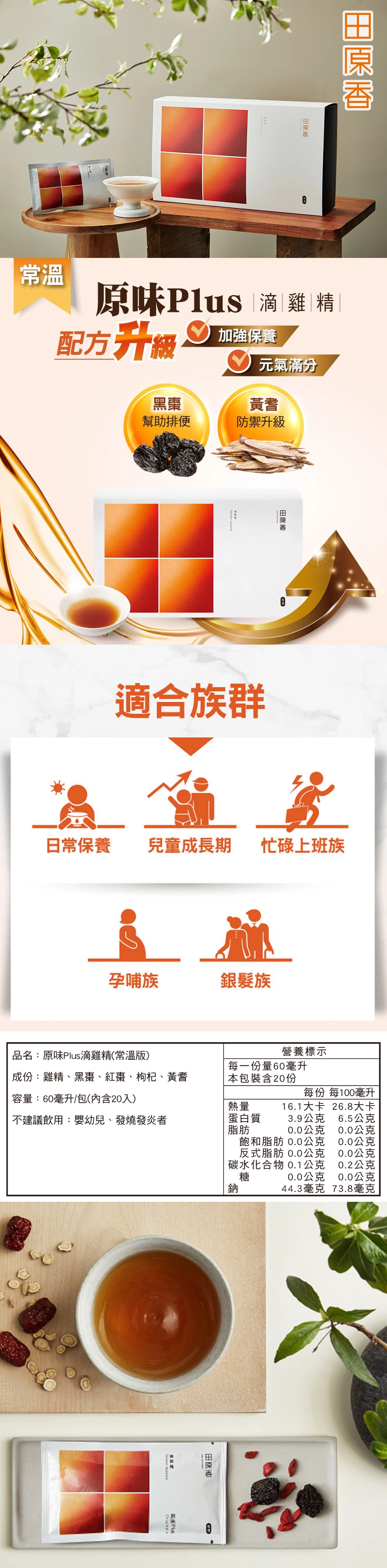 隨時隨地補充日常營養的好選擇!常溫原味 Plus 滴雞精,採用嚴選雞隻,從源頭到製程層層把關,結合傳統厚工炭火熬製工序,炭香濃郁、風味醇厚,滴滴都是精華。以自然雞為基底,搭配黑棗、紅棗、枸杞與黃耆細火熬煮,呈現溫潤順口的多層次風味。