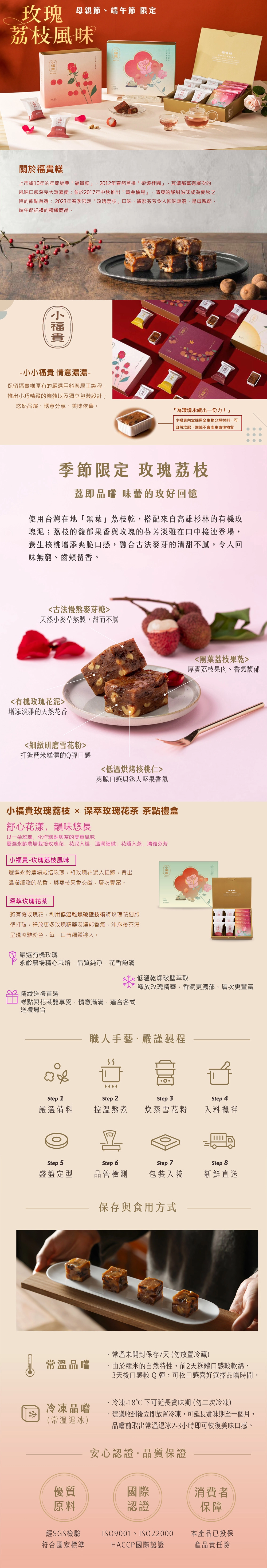 ❶ 玫瑰荔枝小福貴糕:糯米粉、玫瑰花泥 (玫瑰花、水)、麥芽糖、荔枝乾、核桃、砂糖、海藻糖 (純素可食)
